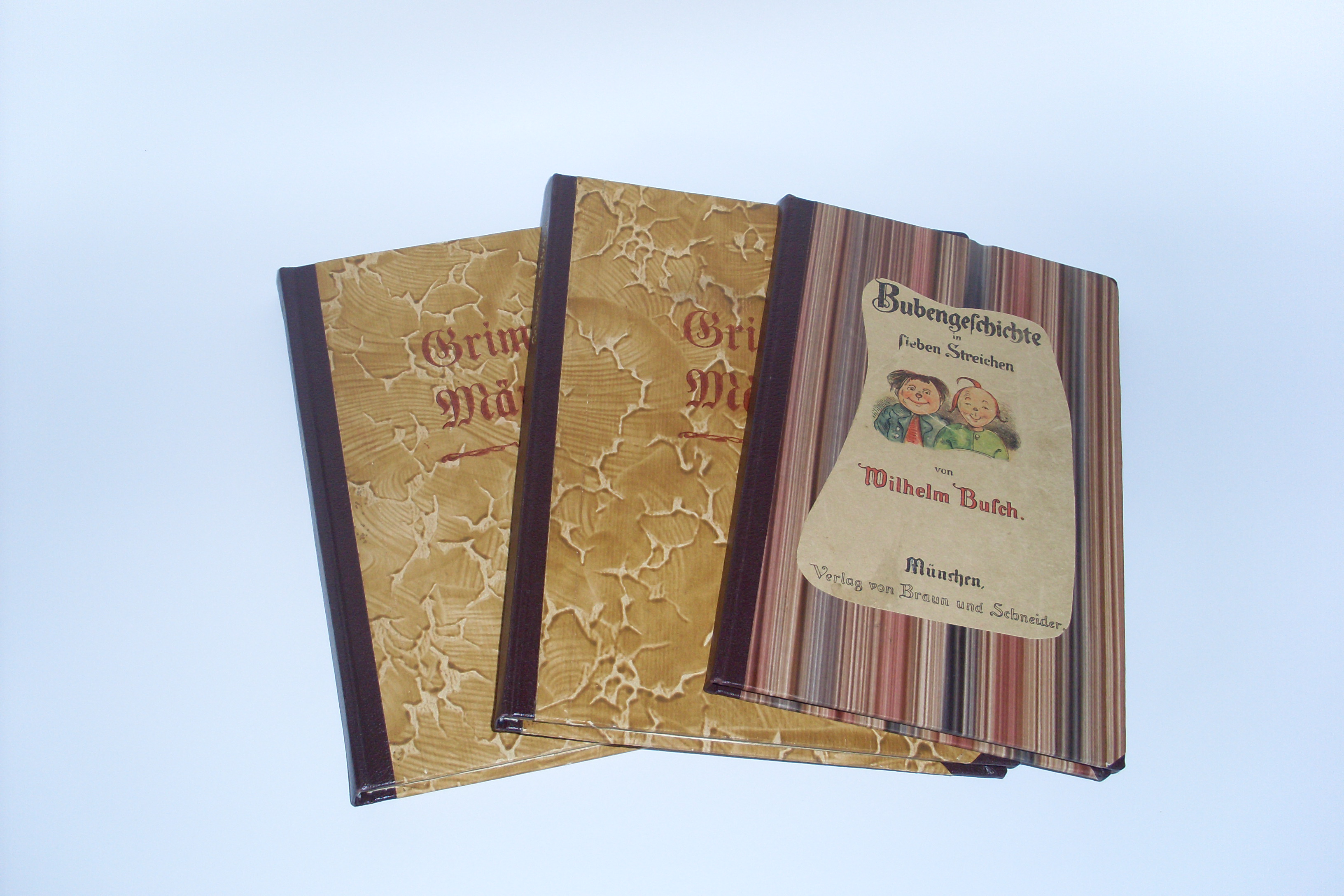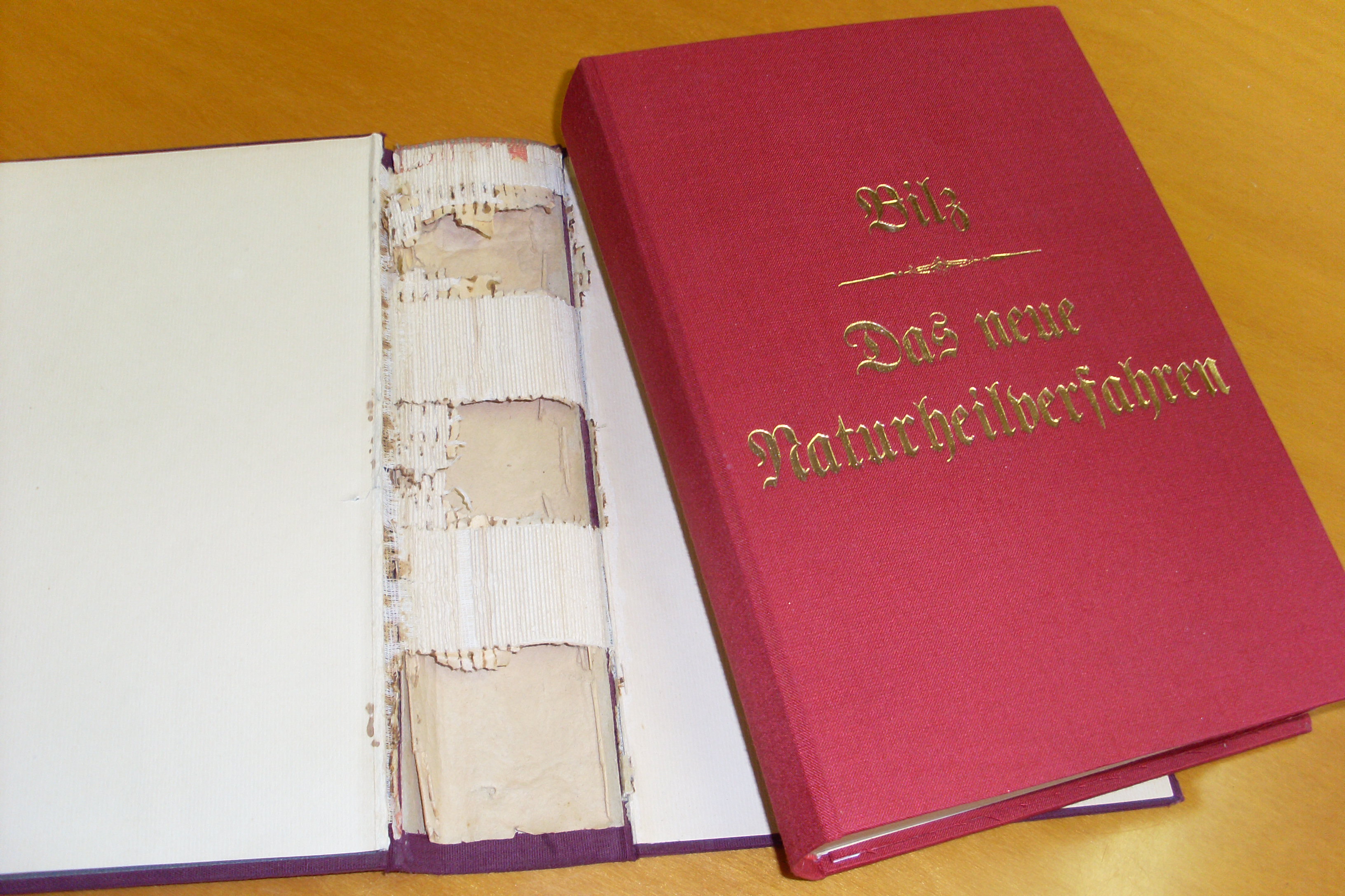 - Wir erhalten den Originaleinband von Ihnen, arbeiten diesen auf und binden das Buch wieder neu ein. Ist der Originaleinband nicht zu erhalten, fertigen wir einen neuen Einband an und orientieren uns dabei am Original.
